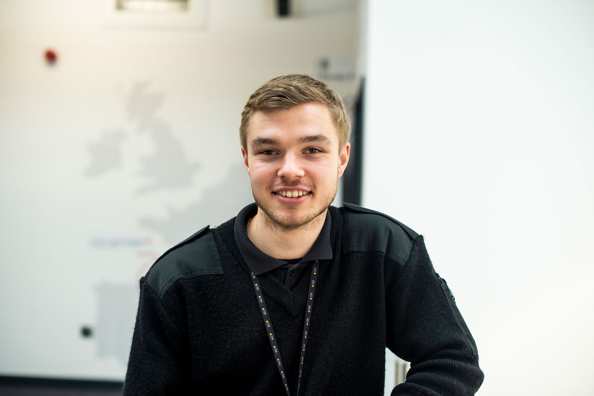Photo L-R: (standing) Andrew Daines, Ryanair Technical Training Manager Stansted, (waving) name: Rares Turcu, (kneeling) name: Jack Hawkins, (kneeling) name: Eleiumark De Jesus, (standing) name: Joseph De Saint Esteban