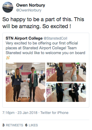 The College was delighted to welcome Owen, currently studying at Burnt Mill Academy in Harlow, as the first trainee to be officially offered a place. Owen commented ‘so happy to be a part of this. This will be amazing. So excited!’